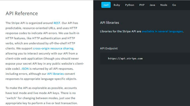 Likewise, one must also point out the various programming languages accepted by the interface and even give the examples in each one of them. One possibility is that of allowing users to choose the language they prefer from the very start, as is the case of the Stripe API documentation, which offers a choice between Curl, Ruby, Python, PHP, Java, Node and Go.