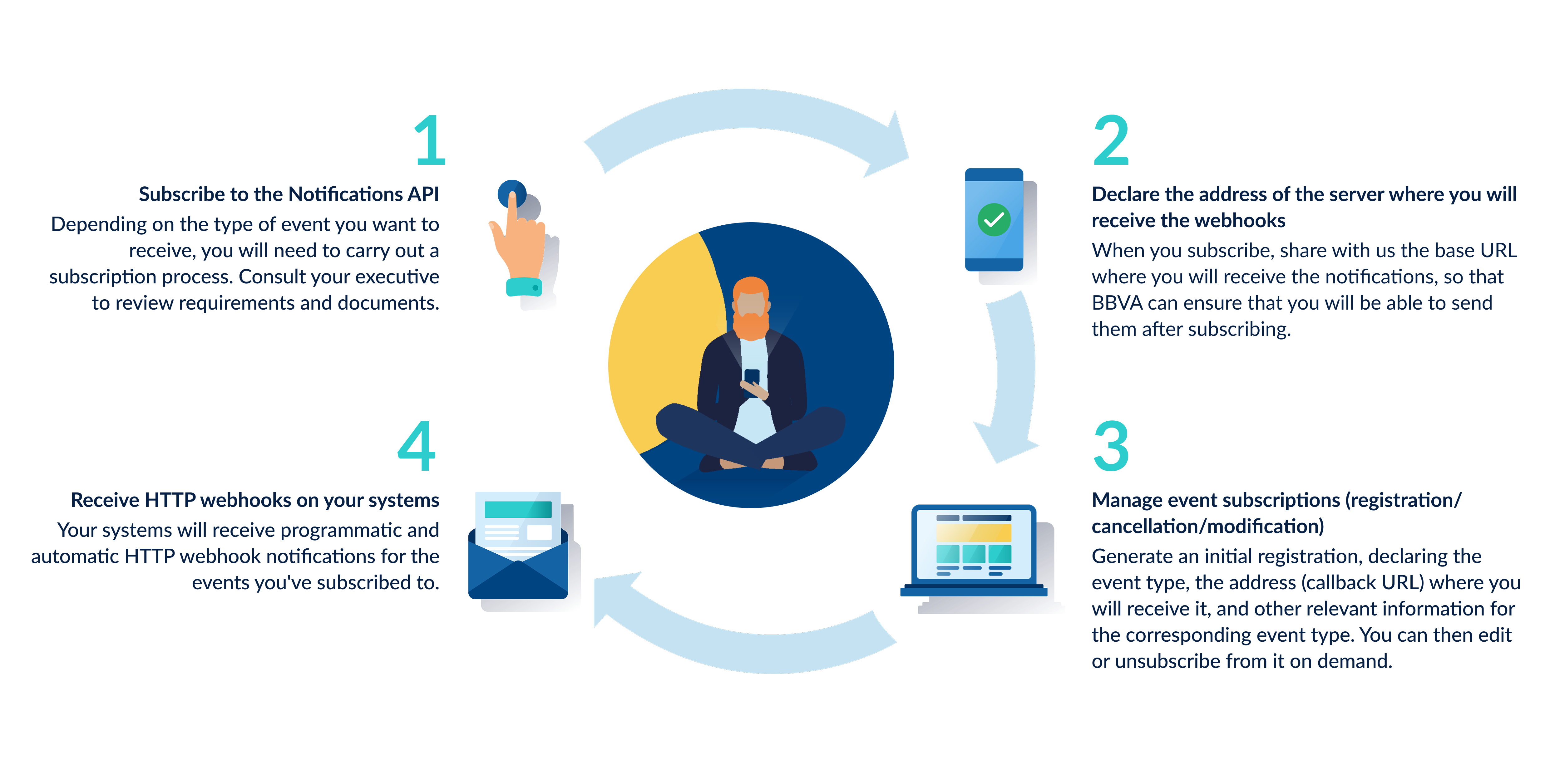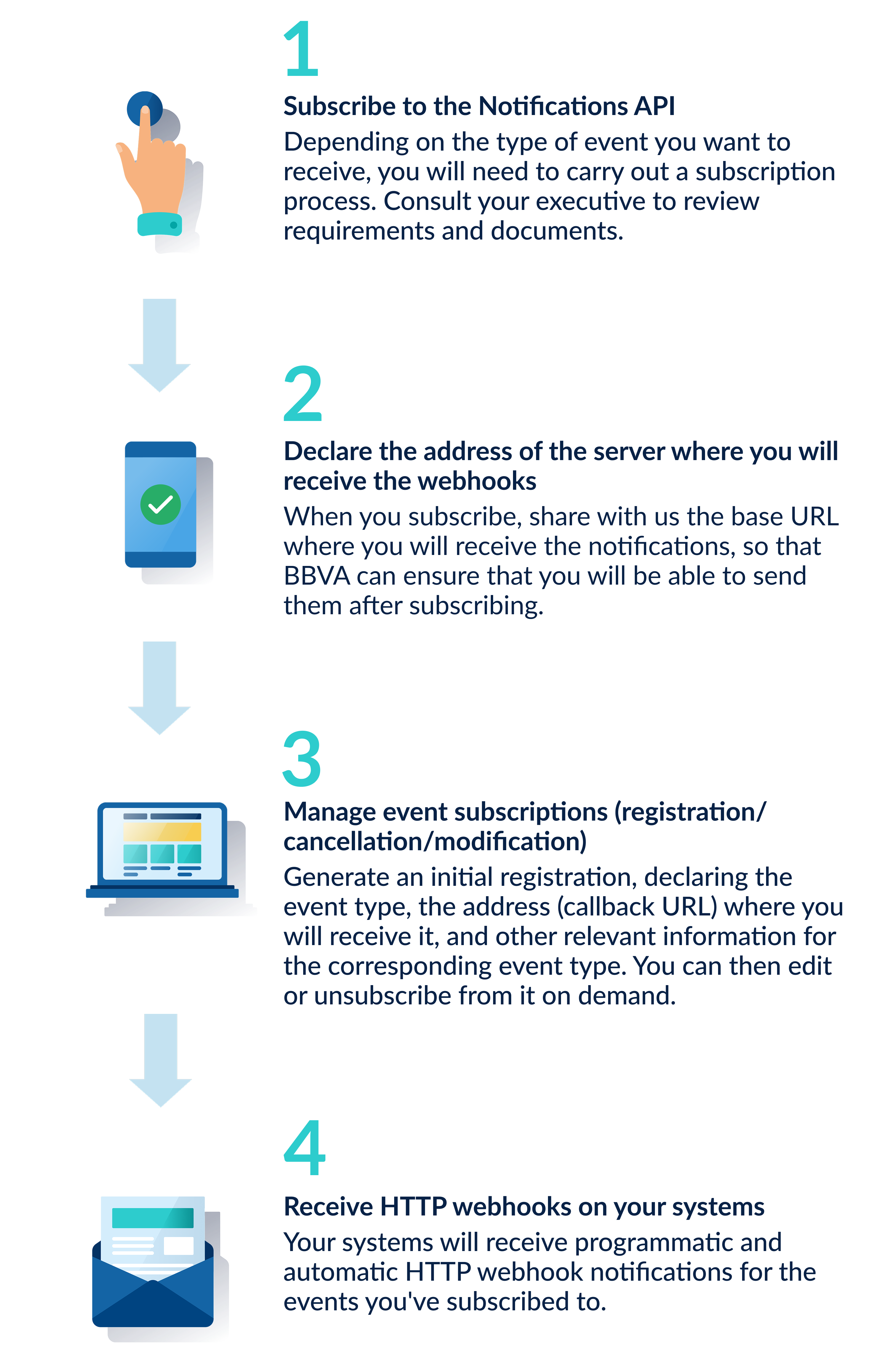 Manage subscriptions to important events for your BBVA products, directly from your systems. The Notifications API enables you to register, unsubscribe, and modify your preferences for receiving HTTP webhook notifications. This ensures that your systems receive the necessary information at the right time.