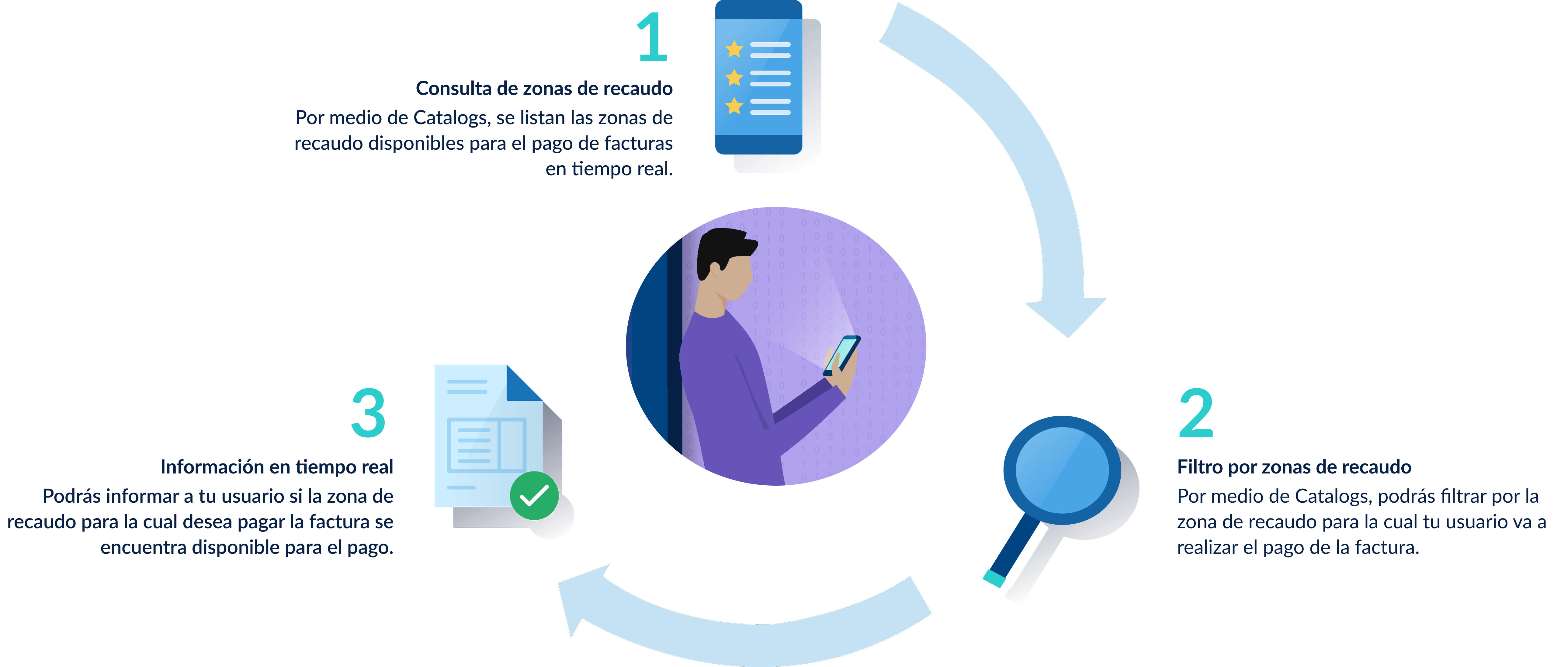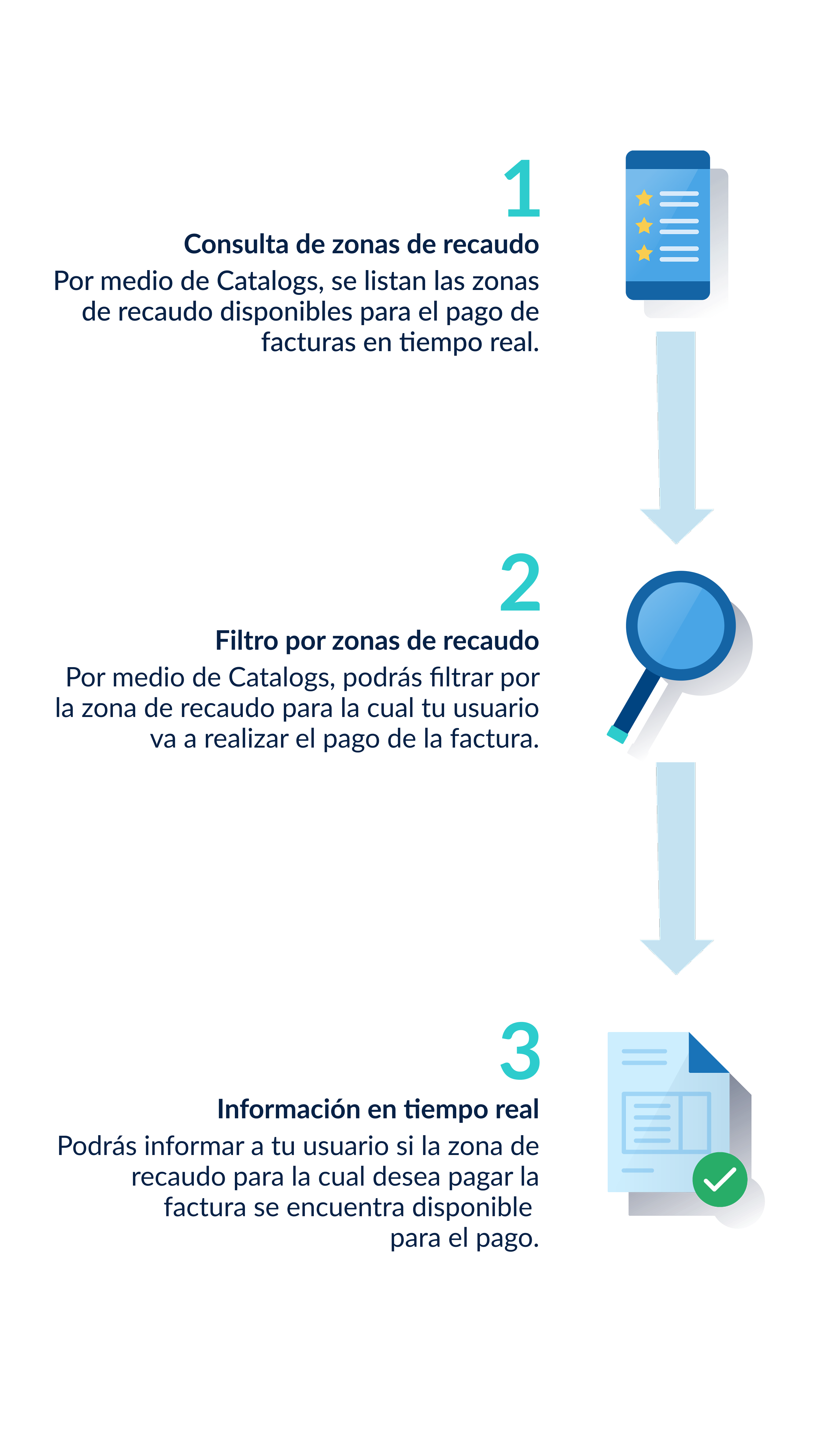Con la API Catalogs puedes consultar el listado de zonas de recaudo disponibles para el pago de facturas en tiempo real.