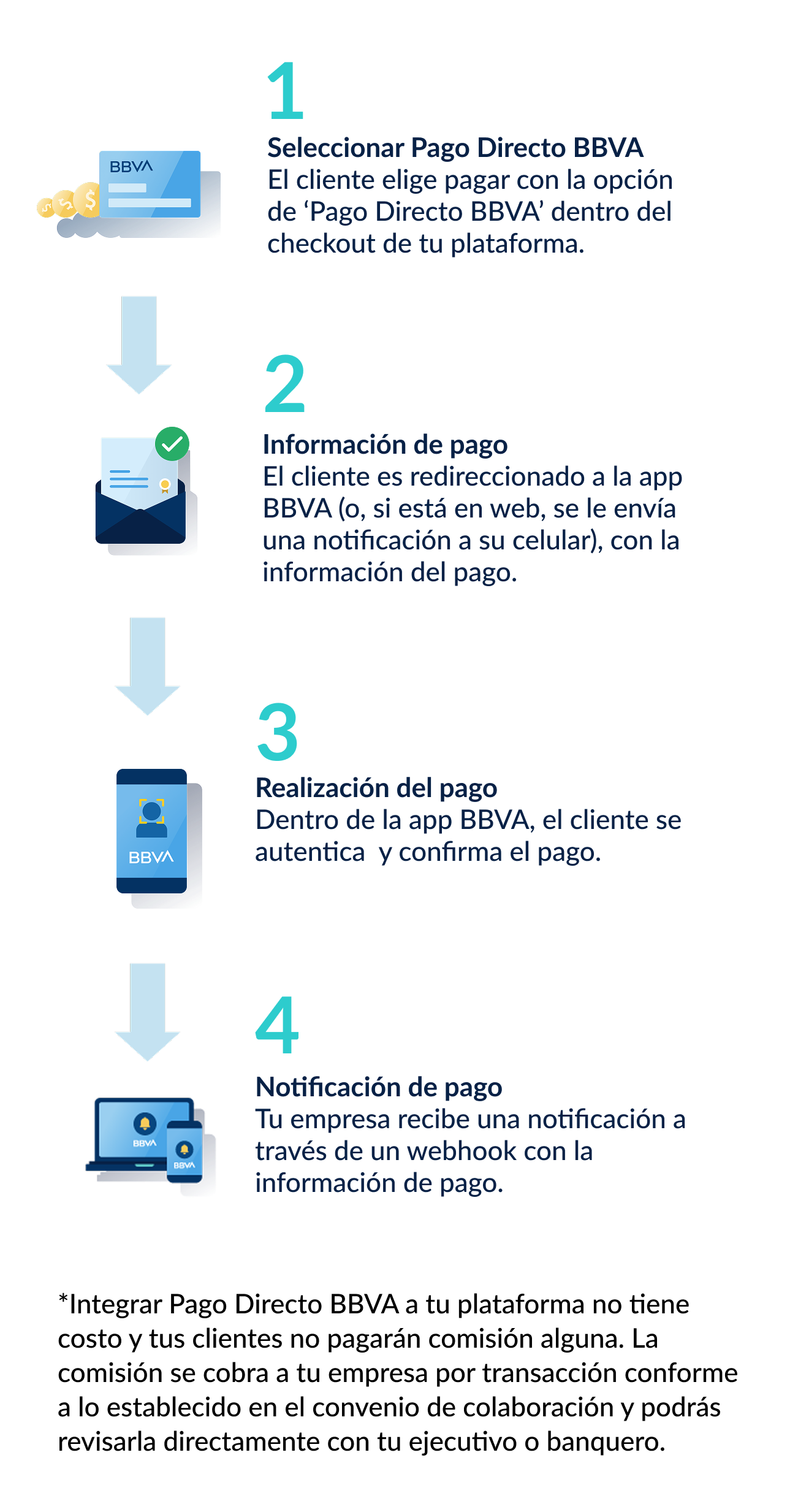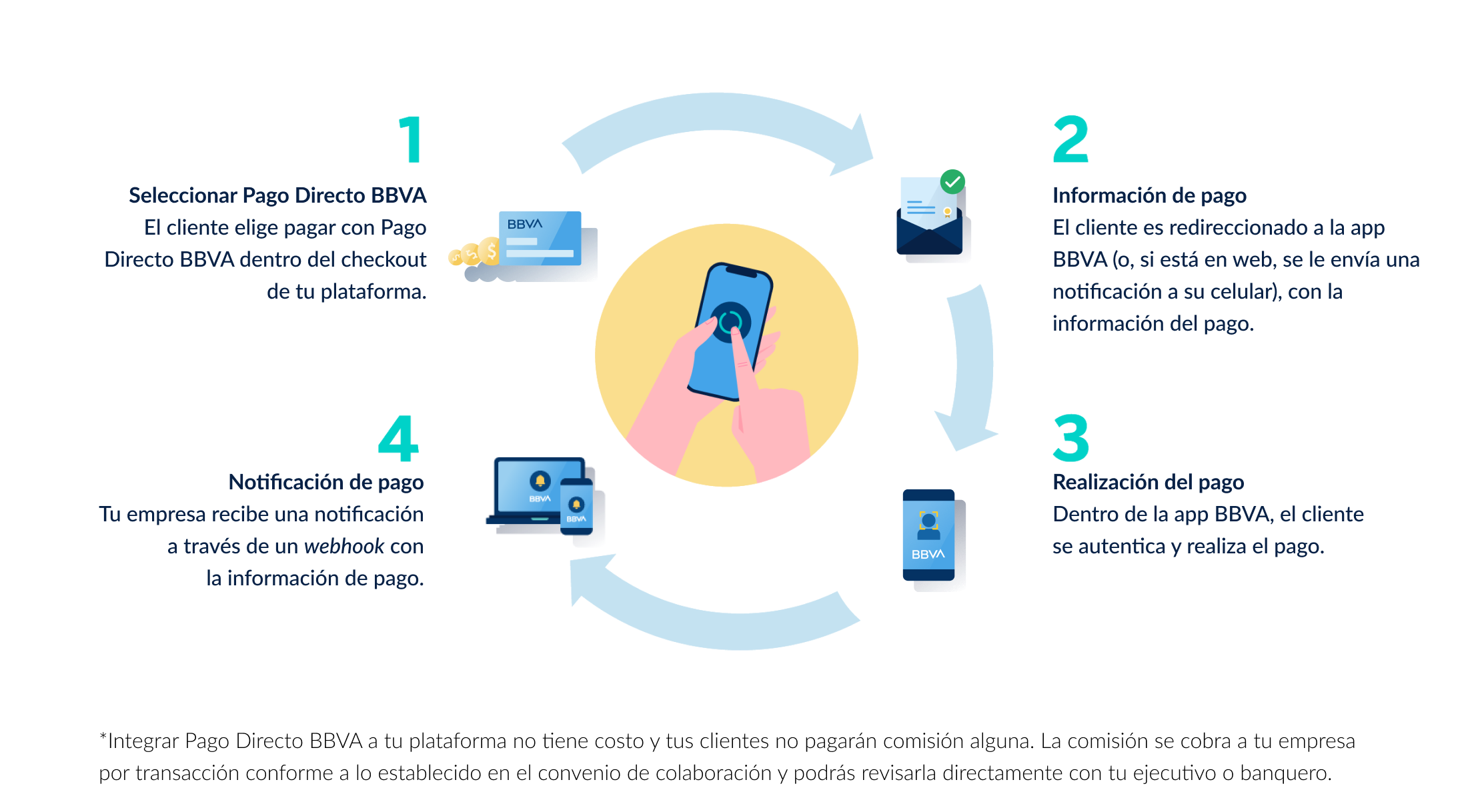 La API Pago Directo BBVA mejora la experiencia de compra de tus clientes facilitándoles el pago con cargo directo a su cuenta BBVA sin necesidad de tarjeta.