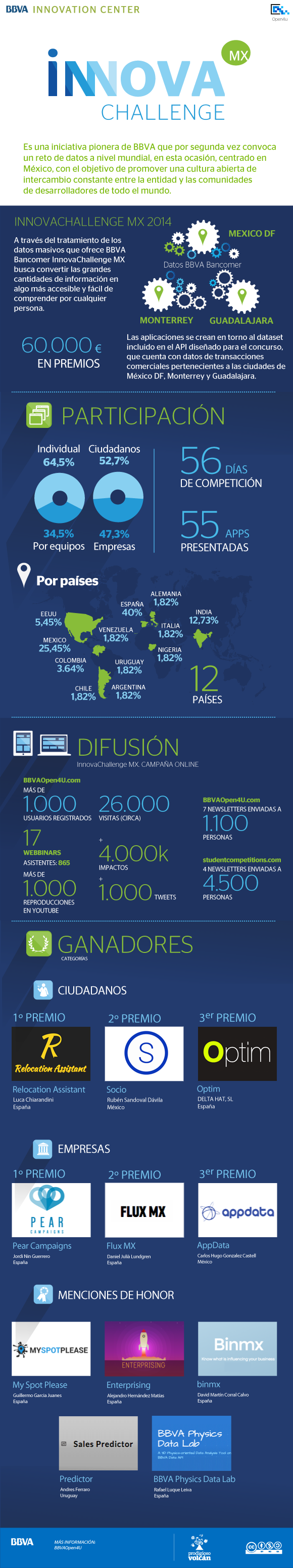 Es una iniciativa pionera de BBVA que por segunda vez convoca un reto de datos a nivel mundial, en esta ocasión, centrado en México, con el objetivo de promover una cultura abierta de intercambio constante entre la entidad y las comunidades de desarrolladores de todo el mundo.